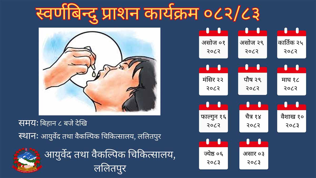ललितपुर । आयुर्वेदमा वर्णन गरिएको बालबालिकाका लागि अत्यन्त लाभदायक औषधियुक्त थोपा स्वर्णबिन्दु प्राशन कार्यक्रम आयुर्वेद तथा वैकल्पिक चिकित्सालय, ललितपुरले सञ्चालन गरिरहेको छ। प्रत्येक महिनाको पुष्य नक्षत्रका दिन नियमित रूपमा खुवाइने स्वर्णबिन्दु प्राशन अन्तर्गत १ वर्षदेखि ५ वर्षसम्मका बालबालिकालाई निःशुल्क सेवा प्रदान गरिँदै आएको चिकित्सालयले जनाएको