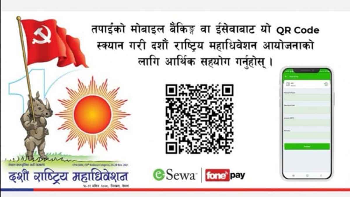 महाधिवेशनका लागि लोगो सार्वजनिकसँगै एमालेले चन्दा प्रयोजनका लागि क्यूआर कोडसँगै इसेवा र फोन पेबाट न्युनतम १०० रुपैयाँ जम्मा गर्न भनेको छ ।