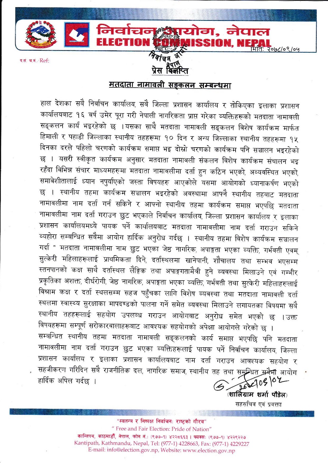 यसरी स्वीकृत कार्यक्रमअनुसार मतदाता नामावली संकलन विशेष कार्यक्रम संचालन भइ रहँदा विभिन्न संचार माध्यमहरुमा मतदाता नामावलीमा दर्ता हुन कठिन भएको, अव्यवस्थित भएको, समावेशीतालाई ध्यान नपुर्याएको जस्ता विषयहरु आएकोले यसमा आयोगको ध्यानाकर्षण भएको छ । स्थानीय तहमा कार्यक्रम सञ्चालन भइरहेको अवस्थामा आफ्नै स्थानीय तहबाट मतदाता नामावलीमा नाम दर्ता गर्न सकिने र आफ्नो स्थानीय तहमा कार्यक्रम समाप्त भएपछि मतदाता नामावलीमा नाम दर्ता गराउन छुट भएकाले निर्वाचन कार्यालय, जिल्ला प्रशासन कार्यालय र इलाका प्रशासन कार्यालयमध्ये पायक पर्ने कार्यालयबाट मतदाता नामावलीमा नाम दर्ता गराउन सकिने व्यहोरा सम्बन्धित सबैमा आयोग हार्दिक अनुरोध गर्दछ ।