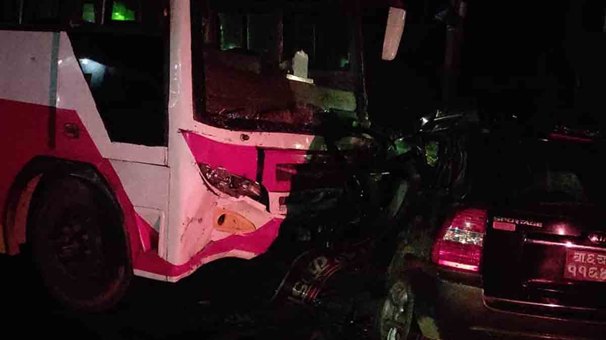 बा ६ च ११६४ नम्बरको कारलाई ट्रकले ठक्कर दिँदा बससँग जुधेर दुर्घटना भएकाे हाे । मंगलबार राति भएकाे दुर्घटनामा सुदीप खनाल र राजेश शर्मा गम्भीर घाइते रहेका छन् ।